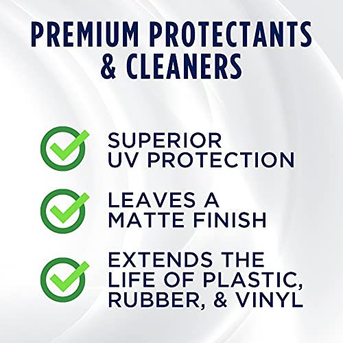 - Versatile – Maintains a like-new appearance, texture, and color on a variety of surfaces including vinyl, plastic, synthetic and natural rubber, gel coat, and more. Do not use on unfinished leathers, fabrics, clear plastic, gauge panels, or headlights