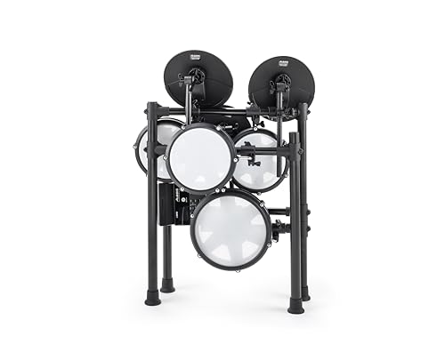 - Genuine Performance Feel – Now bigger 10” dual-zone mesh snare, (3) 8” mesh toms, kick drum tower with pedal and (3) 10″ cymbals: ride, hi-hat with foot controller, crash with choke, on a solid foldable rack