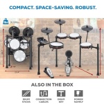 Featuring premium drum heads for a quiet yet natural response: a large 10” dual-zone mesh snare for maximum playability and three 8” mesh tom pads, a kick drum tower with kick drum pedal, a 10” crash cymbal with choke, 10” ride, and 10” hi-hat with foot controller – all mounted on a 4-post aluminum rack for maximum stability and flexibility. The box contains connection cables, drum sticks, drum key, and power supply.