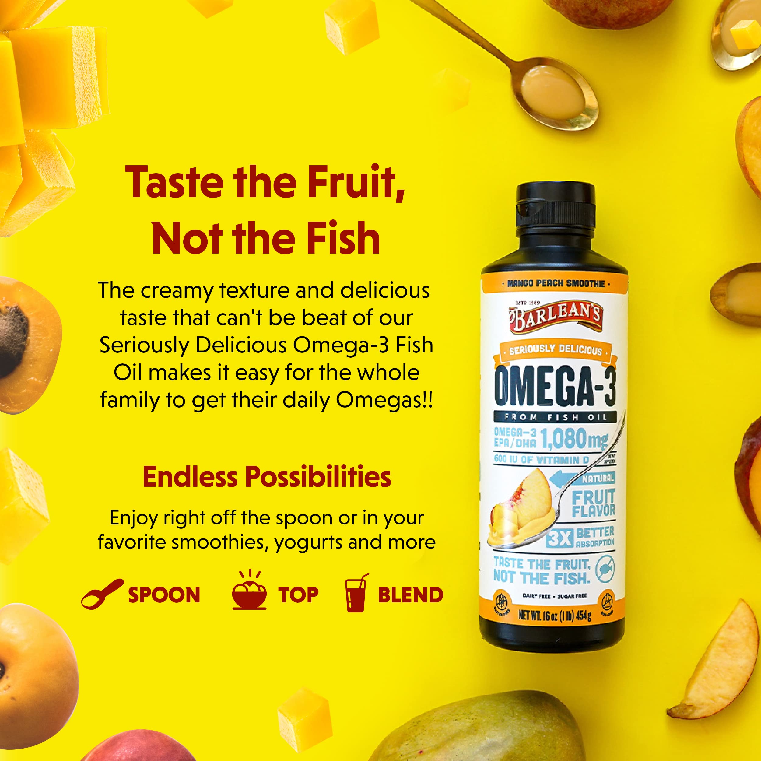 Barlean’s Mango Peach Omega 3 Fish Oil Liquid Supplement with Vitamin D, 1080mg EPA & DHA Fatty Acid, Smoothie Flavored & Burpless for Brain, Joint, & Heart Health, 16 oz