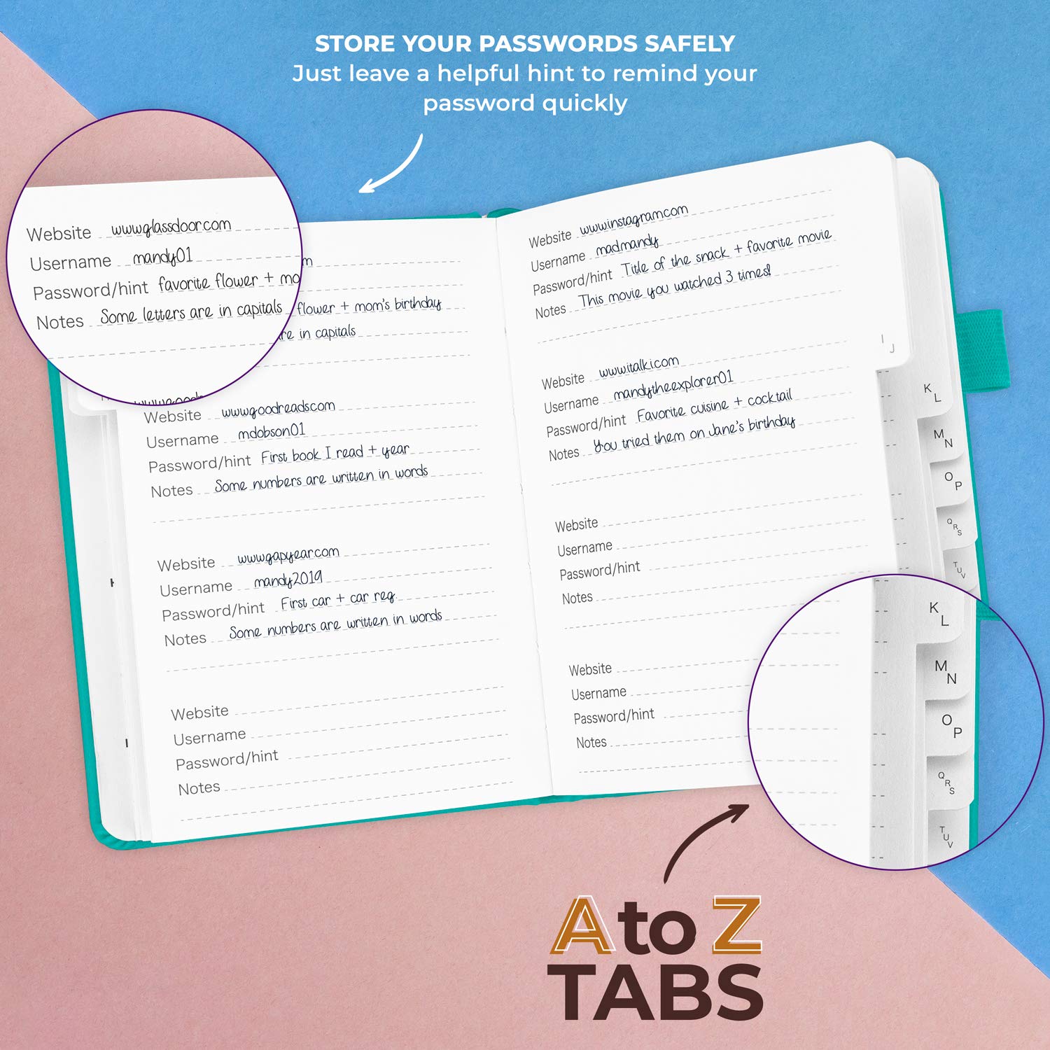 - ALPHABETICAL A-Z TABS – Alphabetic tab system makes it easy to find any password you need. The book also has sections for most important passwords, wireless & email settings, software license information & additional notes.