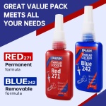 - Value 2 Pack Threadlocker: Medium-strength blue Threadlocker 242 and High-strength red Threadlocker 271, providing a wide range of options for your various needs. 2 x 50ml bottles of thread locker are easy to store and can be used for a long time without drying out or leaking.