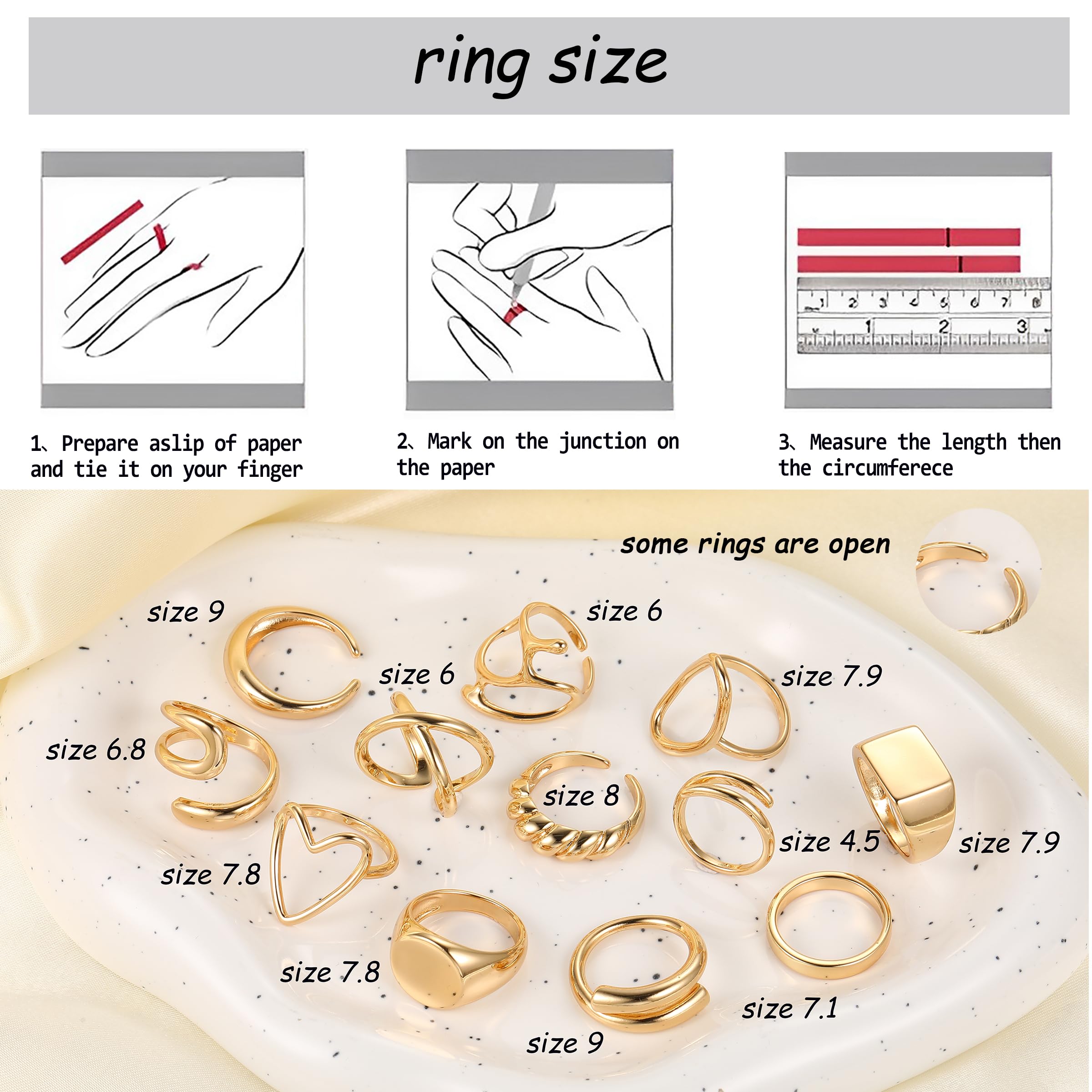- 💎Gold Band Rings💎: You will get a 12 pieces gold ring set. Those rings come in many different styles, include heart, signet, square, tubular,chunky and twist ring. There are enough quantity to meet your different outfits, match a best look for yourself!