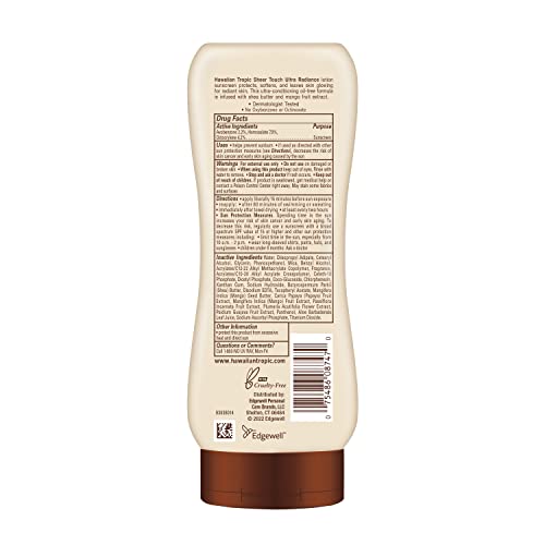 Details: Hawaiian Tropic Sheer Touch Ultra Radiance SPF 30 sunscreen lotion offers triple enhancement for radiant skin; it protects, softens, and leaves skin glowing. This luxurious moisturizing sunscreen formula has a hint of sheen and leaves your skin soft and luminous. Hawaiian Tropic Sheer Touch sunscreen lotion offers broad spectrum UVA and UVB protection in an oil-free and non-greasy formula. This ultra-conditioning formula contains Vitamins C & E, with mango fruit extract and a shea butter complex for skin-loving suncare you can trust. We care for your skin with broad spectrum UVA and UVB protection, and we also do our part to help care for the planet by creating Cruelty-Free sunscreen that’s free from oxybenzone and octinoxate.