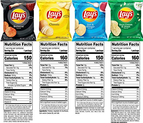 - 40 count pack featuring 10 of each of these Lay’s potato chips favorites in 1 oz bags – Classic, Barbecue, Sour Cream and Onion, and Salt and Vinegar