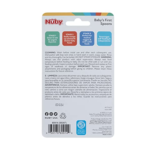 Details: Babies grow up fast. When introducing new foods, utensils that help little ones transition from soft foods to semi-solid foods are essential to helping babies learn to self-feed. Nuby’s Baby’s First Spoons support each stage of self-feeding, from soothing sore gums to helping baby learn independence. Stage 1 is great for yogurts and purees, while Stage 2 easily scoops up thicker foods like oatmeal. When baby can handle more solid foods, the Stage 3 spoon is perfect for foods like mashed veggies. Baby’s First Spoons are designed to be easy for baby to grasp and hold. Nuby’s Baby’s First Spoons are made of BPA-free materials with your family’s safety in mind.
