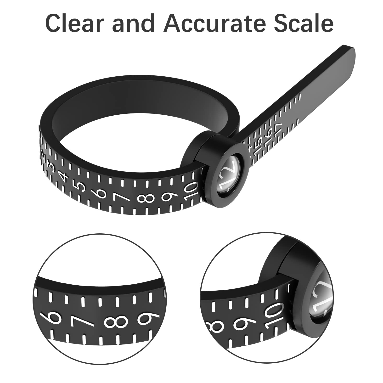 - 🛠️ User-Friendly Design: Designed like a belt for simplicity; just slide the end through the buckle to form a ring, adjust to fit comfortably on your finger, and read the size easily through the magnifying glass.