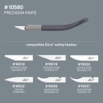 The Slice 10580 Precision Knife’s unique handle offers an innovative finger grip that gives the user precise control for detailed cuts and intricate shapes. Its non-slip inner ring coating and cross-hatched grip ensure that the tool responds to your every move, while the safety cap protects against accidents between uses. This lightweight cutter ships with a Slice 10518 straight-edge, rounded tip ceramic craft blade that lasts 11.2 times longer than comparable steel blades. All Slice ceramic blades are non-sparking, non-magnetic, chemically inert, safe up to 1600 degrees Celsius, and never rust.