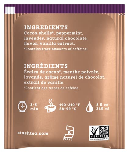 Details: This unique herbal tea blends chocolate flavors with aromatic lavender and cool peppermint for a sophisticated cup. Add a touch of sugar and a splash of milk for a delightful dessert tea. Ingredients: Cocoa Shells, Peppermint, Lavender, Natural Chocolate Flavor, Vanilla Extract. Very low caffeine. Brewing Instructions: 1 tea bag | 8 oz water | 190-210° f | 3-5 min. Each package contains 6 boxes of 18 tea bags (108 tea bags total).