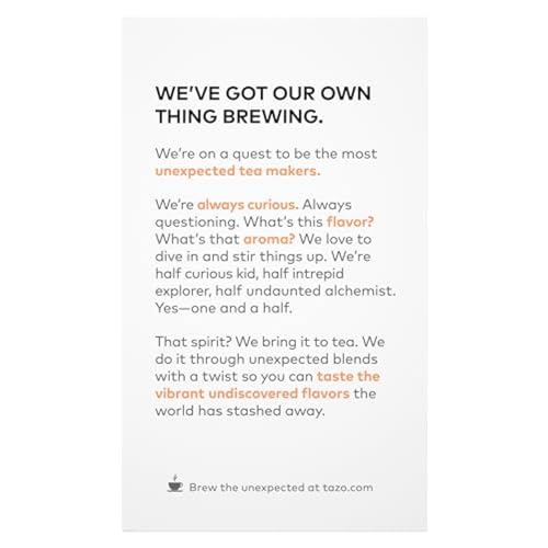 Details: Tazo Wild Sweet Orange Herbal Tea is filled with a juicy infusion of orange peel, citrus herbs, lemongrass, licorice root, and tangy hibiscus. This unsweetened tea is blended with the perfect combination of herbs and citrus to make the best cup of tea. With 20 individually wrapped herbal tea bags that preserve the freshness you love in every box, you can enjoy this caffeine-free tea any time of day! Add one Tazo tea bag to a cup, top it up with hot water, and let it brew for 5 minutes to release all the bright freshness inside. Enjoy our orange tea hot for an invigorating flavor or cold for a spot of cool refreshment. You may also enjoy our range of other herbal flavored teas, each with its own unique aroma and flavor. At Tazo, we’re serious tea lovers, and we believe in the joy of tea. We believe each cup of tea should add a little joy to your day, whether you’re drinking it as your morning tea or as an afternoon refreshment. That’s why we seek out the most delicious tea leaves, spices, and botanicals to craft exhilarating and unexpected blends that delight the senses. Our tea buyers travel to origin countries regularly to taste and select the world’s finest-quality teas and botanicals, and we carefully create our blends to craft complex flavors that complement each unique tea. Our tea experts are meticulous about blending because it lets us innovate taste profiles that are unlike those at any other tea brand. We’re always curious, always seeking, always questioning, and it’s the unpredictable, the unforeseen that drives us. They drive us away from our safe comfort zone in a commandeered golf cart or on the first flight we could find to who knows where or to the last stop of the subway, whichever gets us to points unexplored.