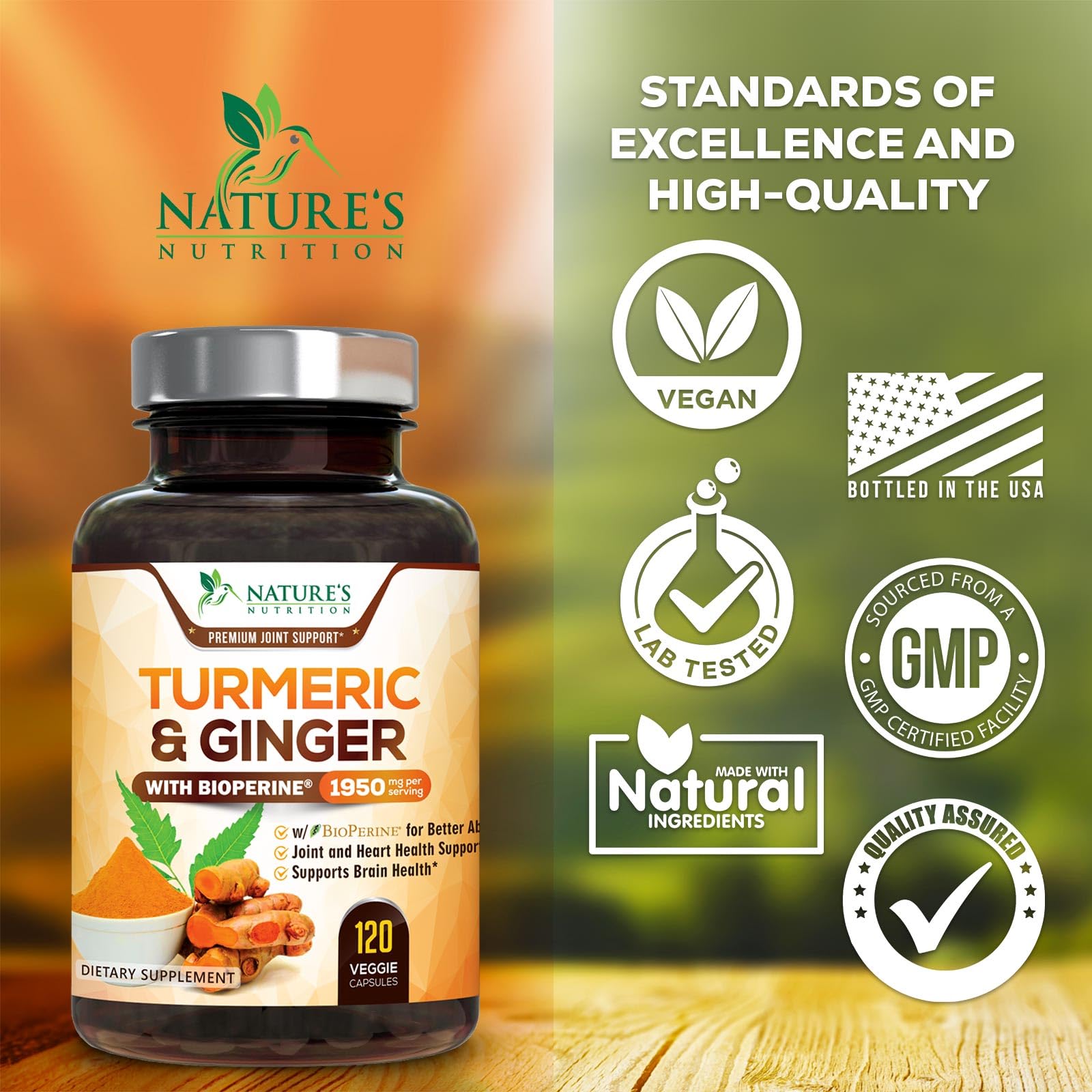 Turmeric Curcumin with BioPerine & Ginger 95% Curcuminoids 1950mg – Black Pepper Extract for Max Absorption, Nature’s Joint Support Supplement, Herbal Turmeric Pills, Vegan Non-GMO – 120 Capsules