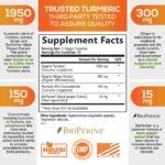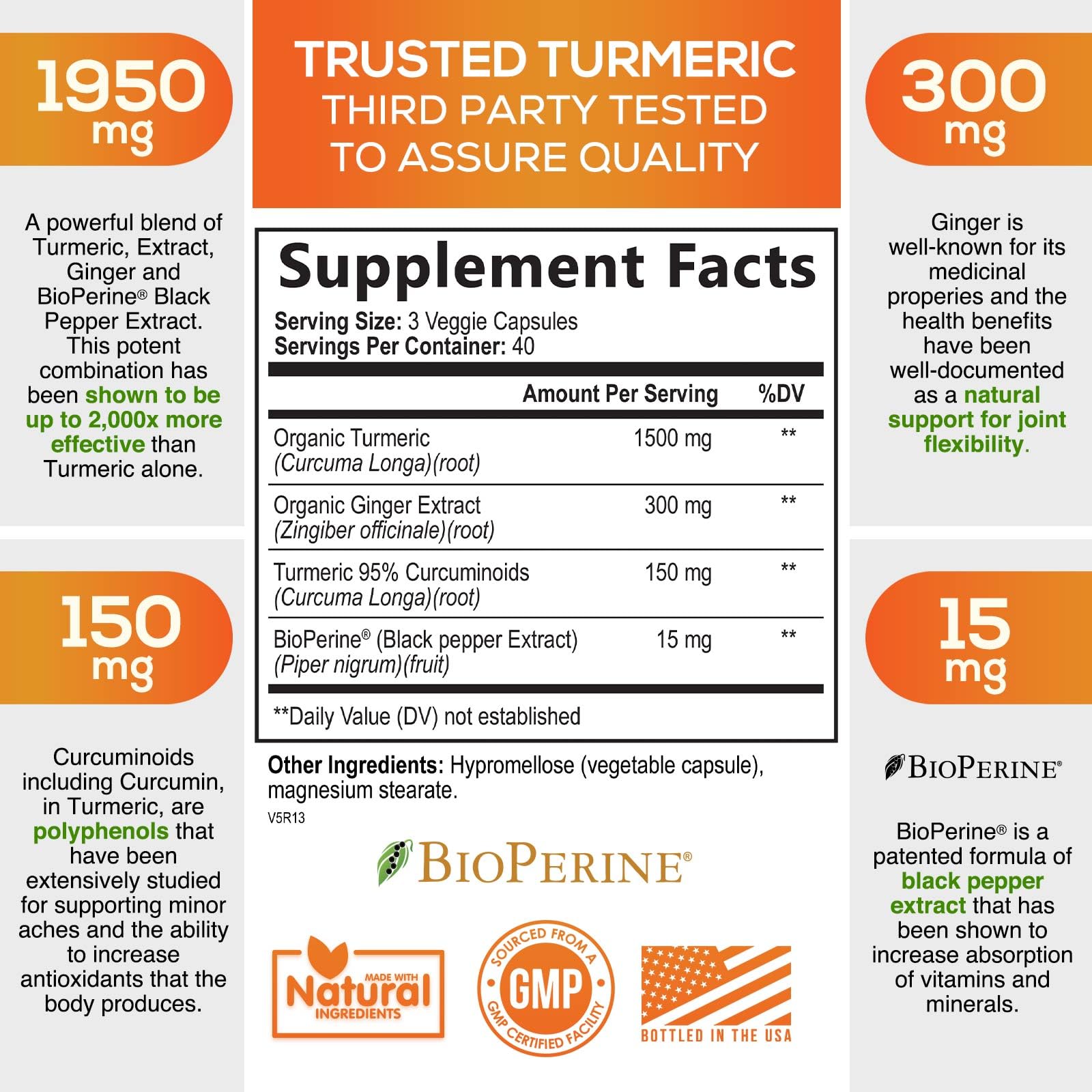 - EXTRA STRENGTH TURMERIC: Our premium T3 Turmeric Curcumin Complex 1950mg; with 95% Standardized Curcuminoids and Ginger; and enhanced with 15mg BioPerine to provide maximum absorption and bio-availability