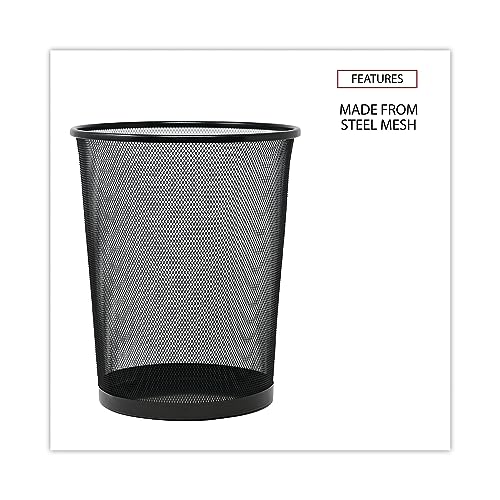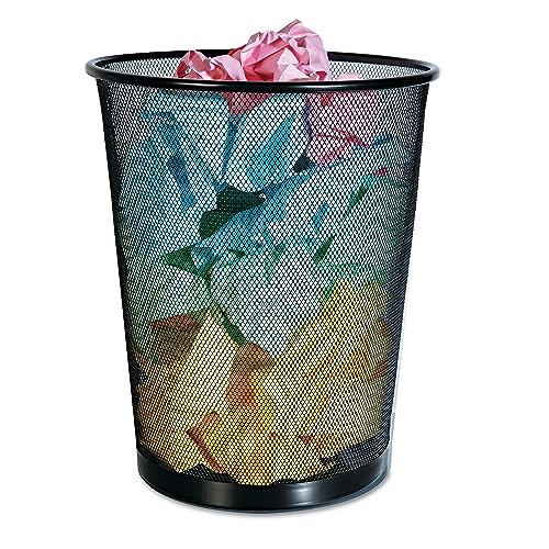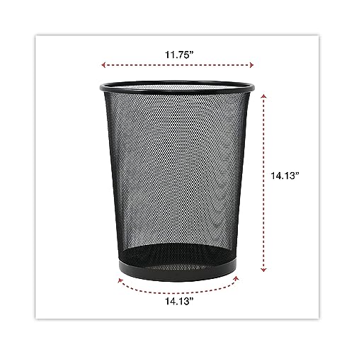 Details: Durable and sturdy, black mesh wastebasket keeps workspaces neat and tidy. Stylish design of mesh looks great while keeping trash in its place. Use with or without a can liner. Solid rim makes it easy to carry and unload. Breathable mesh design prevents odors from getting trapped. Great for under the desk and inside work areas. Powder coated.