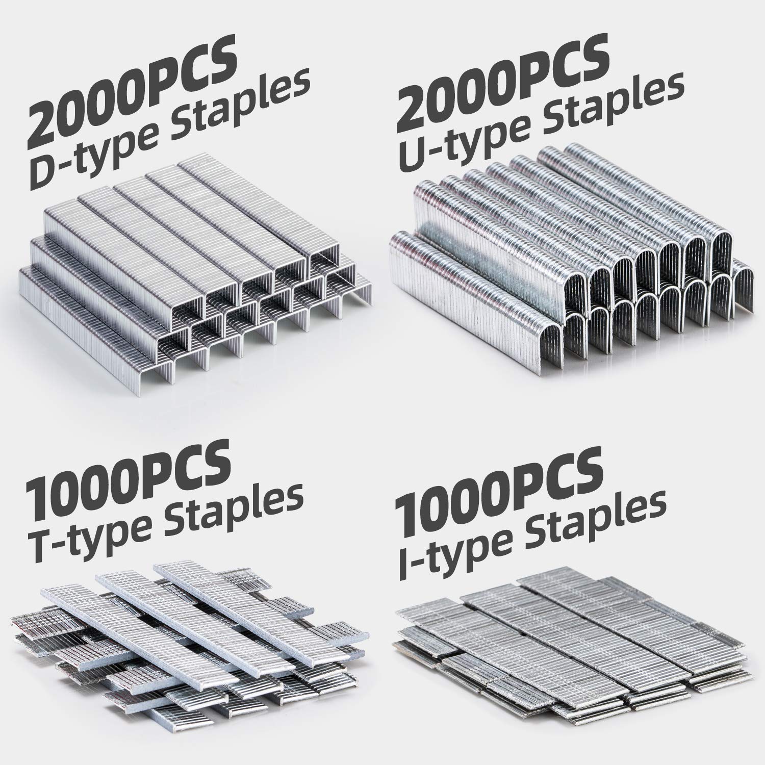 - Versatile Fastening Tool – YEAHOME 4-in-1 Staple Gun accepts D-shaped, U-shaped, T-shaped, and Pin Staples. This kit comes with Remover, Gloves, 2000pcs of each 7/16″ D-Type and 1/2″ U-Type , 1000pcs of each 3/8″ T-Type and 5/8″ Pin Brad Nails for a wide variety of applications: general DIY repairs, crafting, decorating, upholstery projects, roofing, and more.
