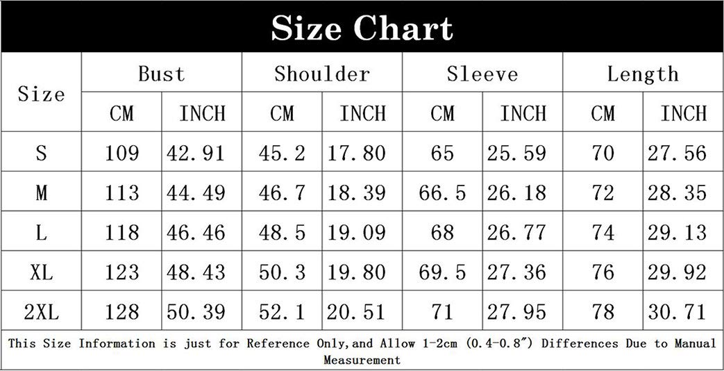 XXL — Bust 128cm/50.39″ — Sleeve Length 71cm/27.95″ — Shoulder 52.1cm/20.51″ — Length 78cm/30.71″