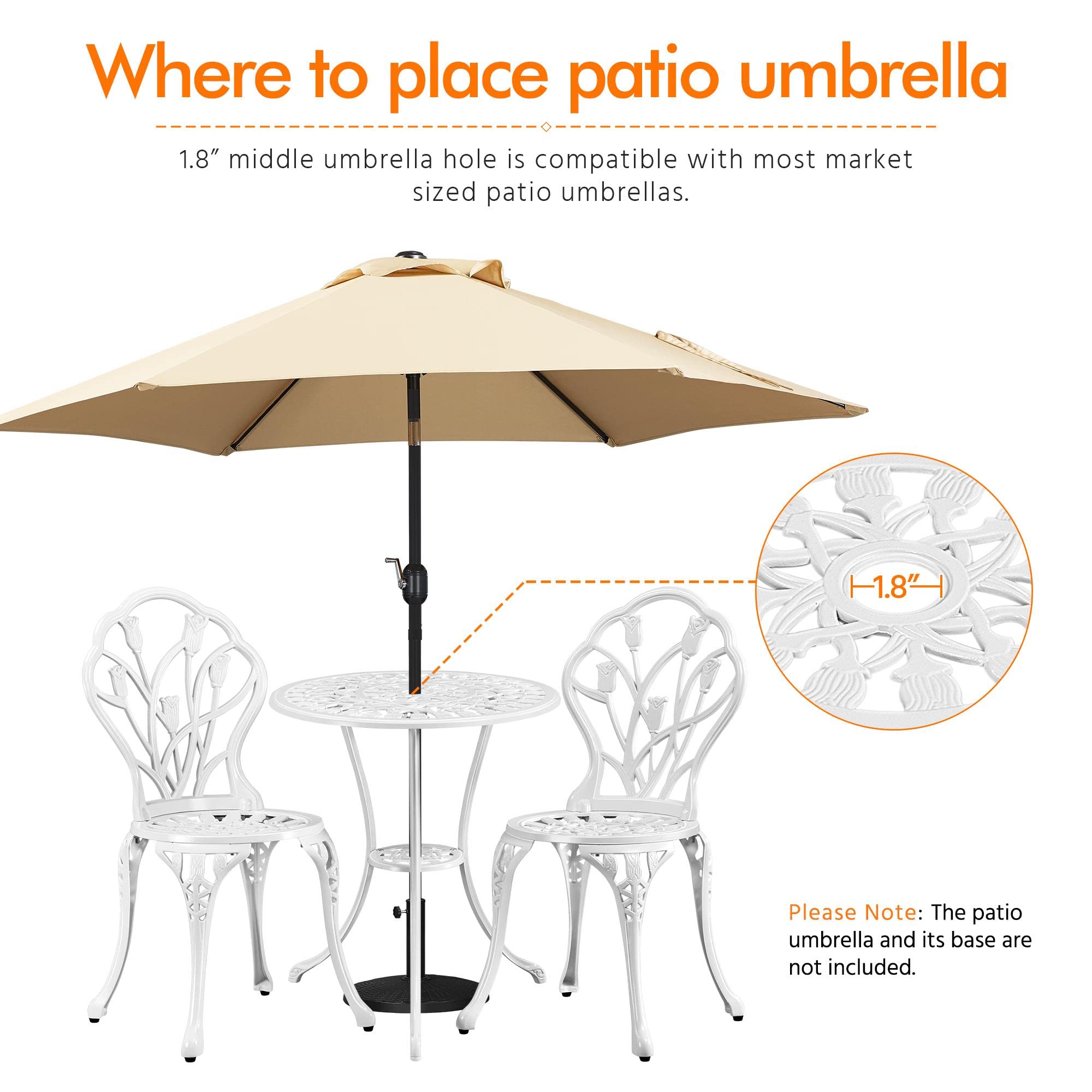 - 3-piece Bistro Set: Comprising a bistro outdoor table with an umbrella hole and a pair of dinning chairs in the same style. This stylish and classic garden set features practical functions that is capable of well serving your courtyard time
